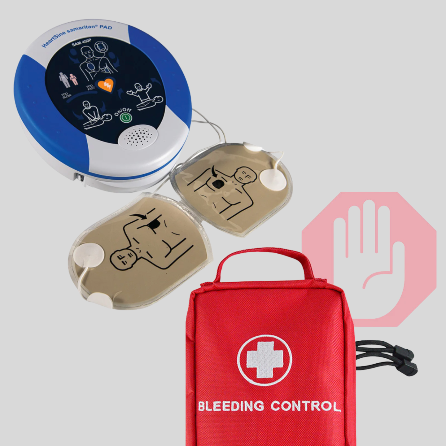 AED's, bleeding control trauma kits, Nitrile gloves, and disinfectants. Supplies for safeguarding the workplace.
